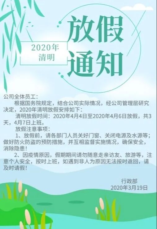 ② 节日注意事项:最好向员工进行一些节日注意事项提示,保证员工安心、健康过节,避免过节意外。尤其本次清明节因为疫情原因,需提醒大家尽量避免跨区域旅行,以免造成需持续隔离的状况发生导致影响工作,和告知相关的处理措施。