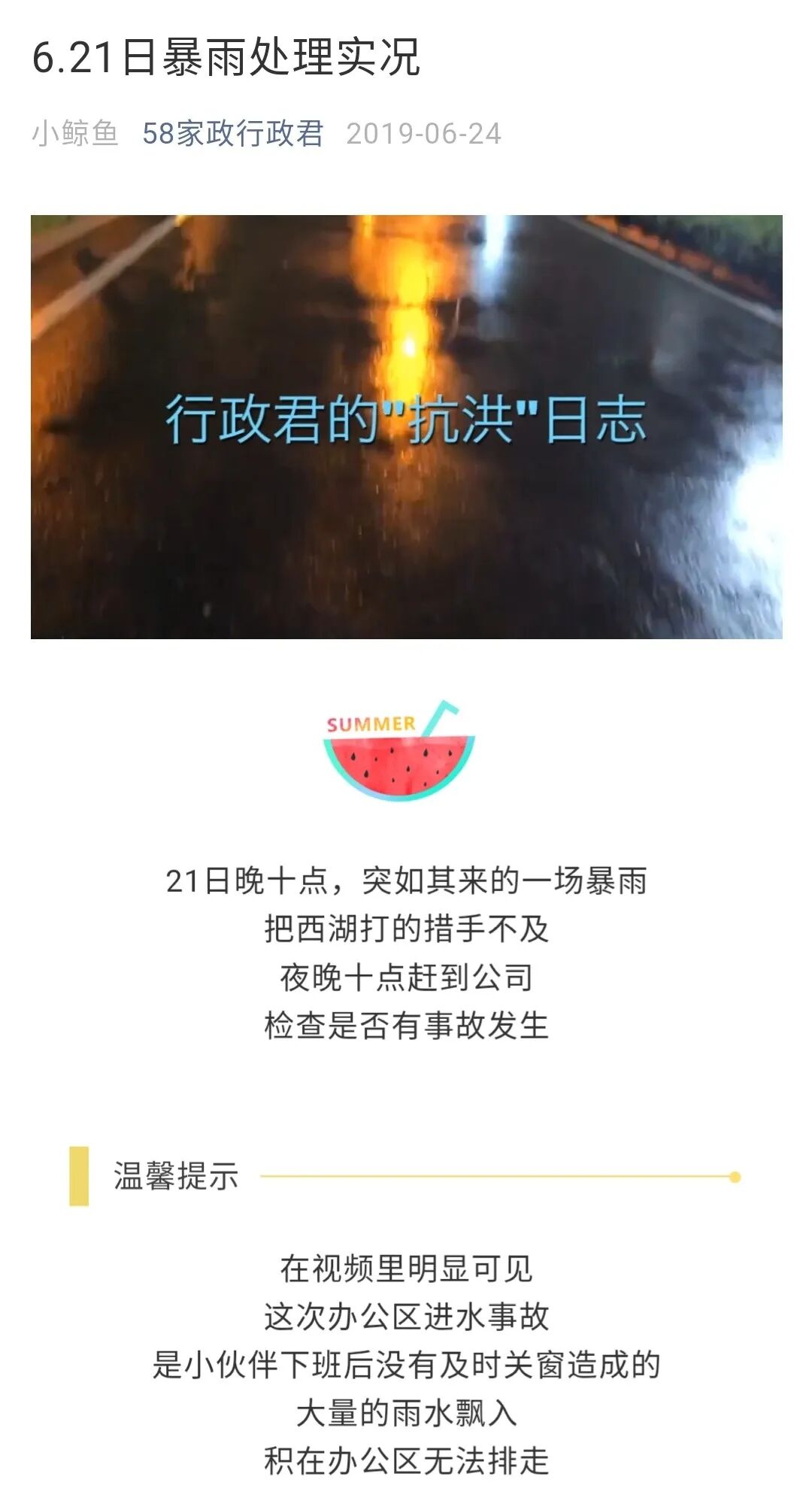vlog记录处理实况:利用vlog这样的特殊“写法”,来记录行政人在突发极端天气下的应对之举,既真实又动人。可以有效还原现场场景。让员工直观感受到行政er具体做了哪些事情。