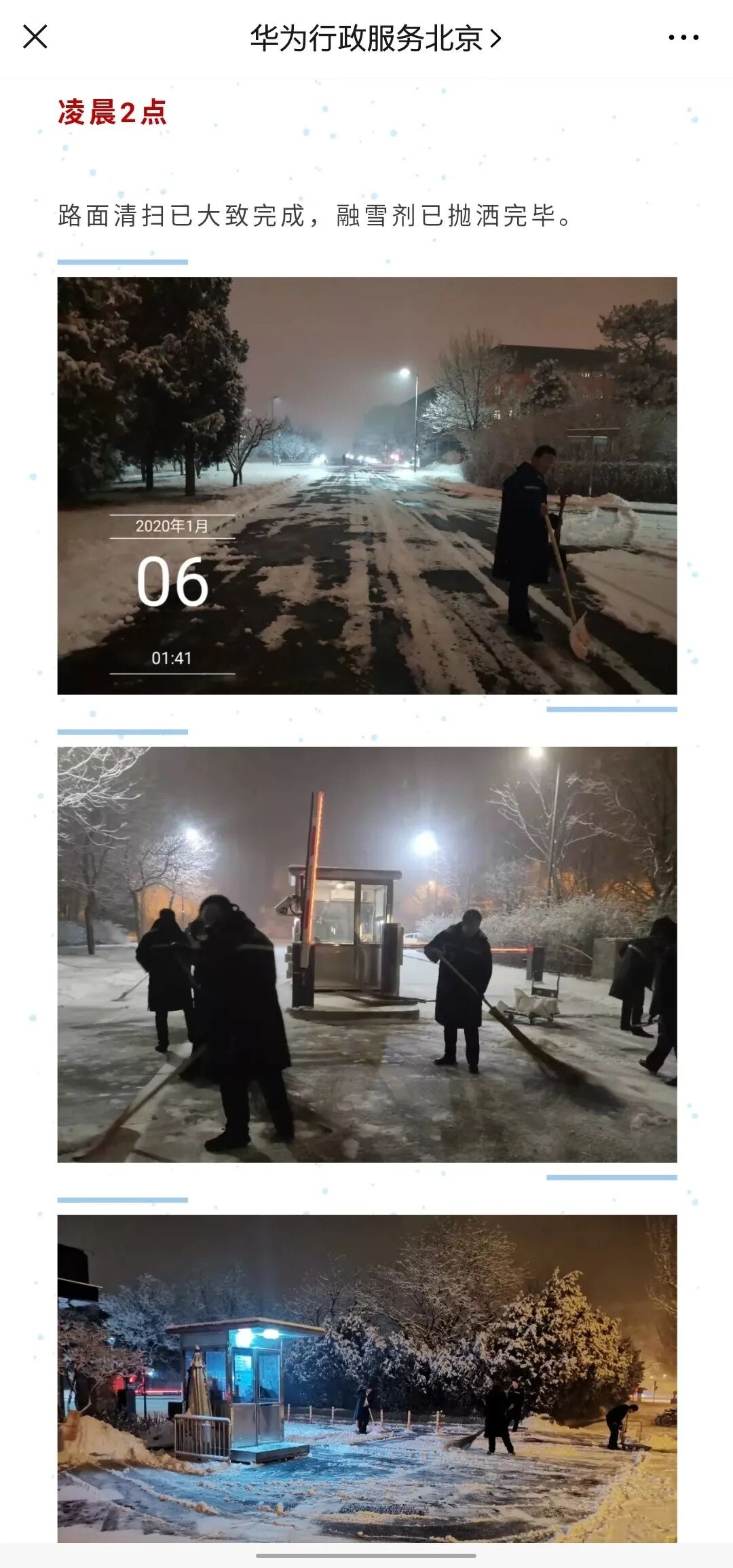 再现应对时间线:例如,华为的行政er就在雪天通知中,再现了前一晚10点至次日早晨8点半之间,安保等人为清扫积雪、保证员工上班安全通畅所做出的努力。