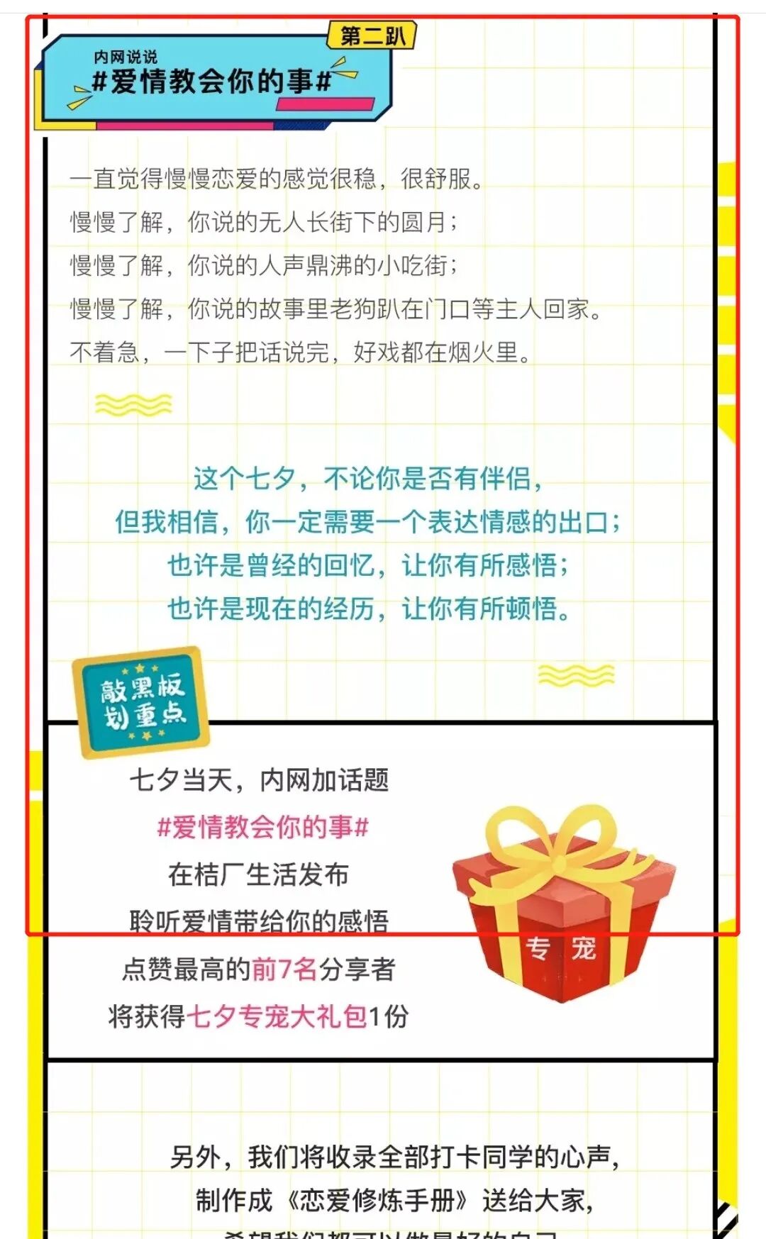 推送土味情话:在情人节、七夕节这样惯于“说爱”的节日里,不如试试在通知里对员工们说说土味情话,既温情,又具备了娱乐性。