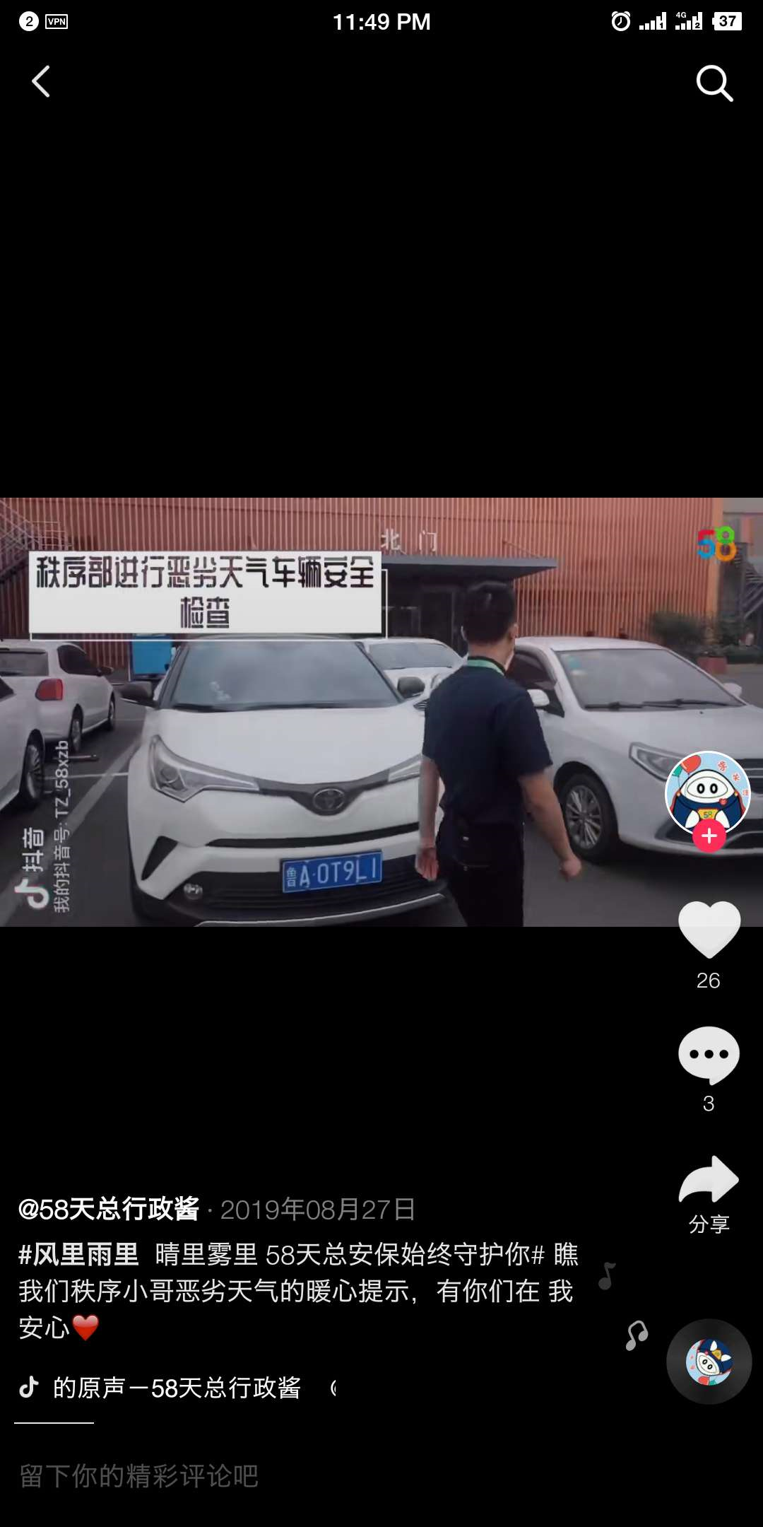 短视频体现措施:例如,58天总行政就在抖音上分享了秩序部在恶劣天气里,对车辆进行安全检查的举措。标题内容中写明“晴里雾里 58天总安保始终守护你”,温馨又暖心。